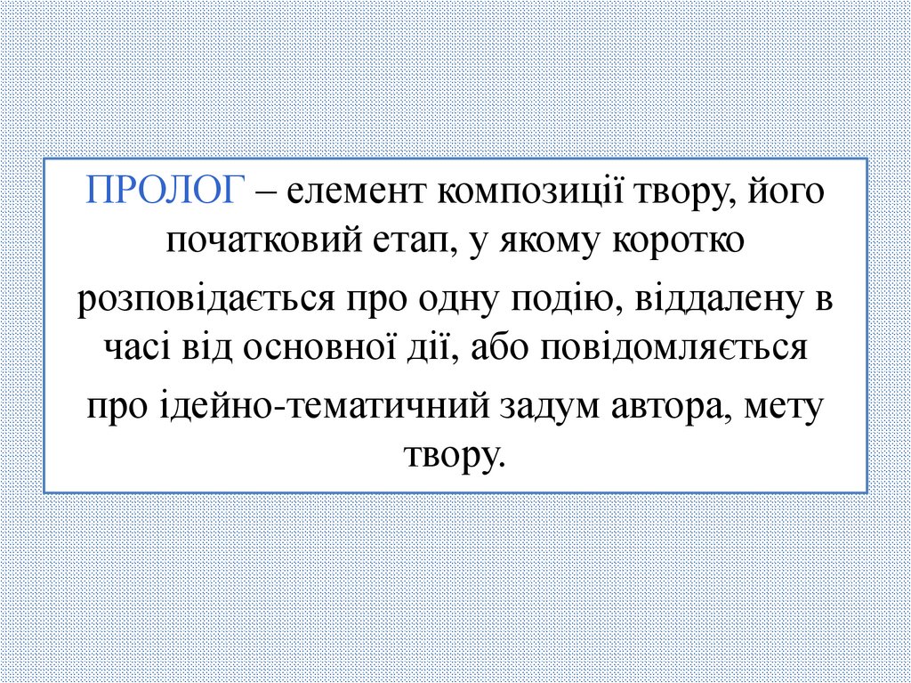 ПРОЛОГ – елемент композиції твору, йогопочатковий етап, у якому коротко