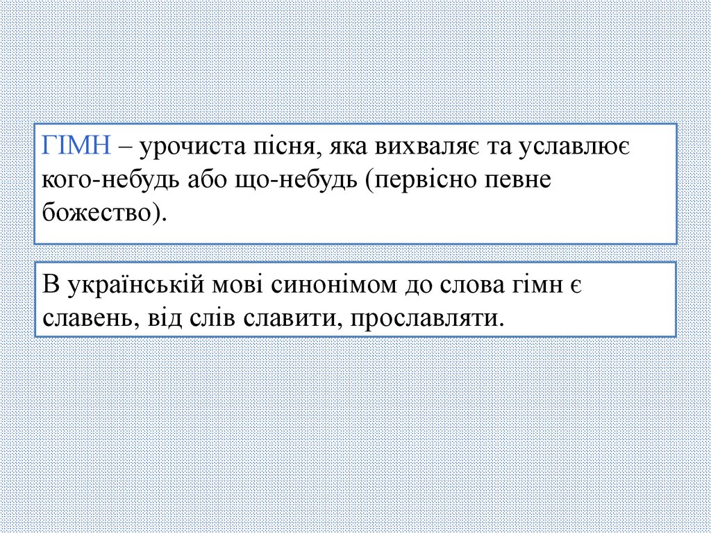 ГІМН – урочиста пісня, яка вихваляє та уславлюєкого-небудь або що-небудь (первісно певне