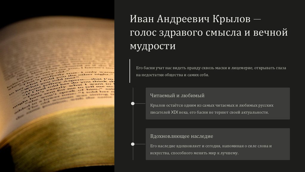 Его басни учат нас видеть правду сквозь маски и лицемерие, открывать глаза