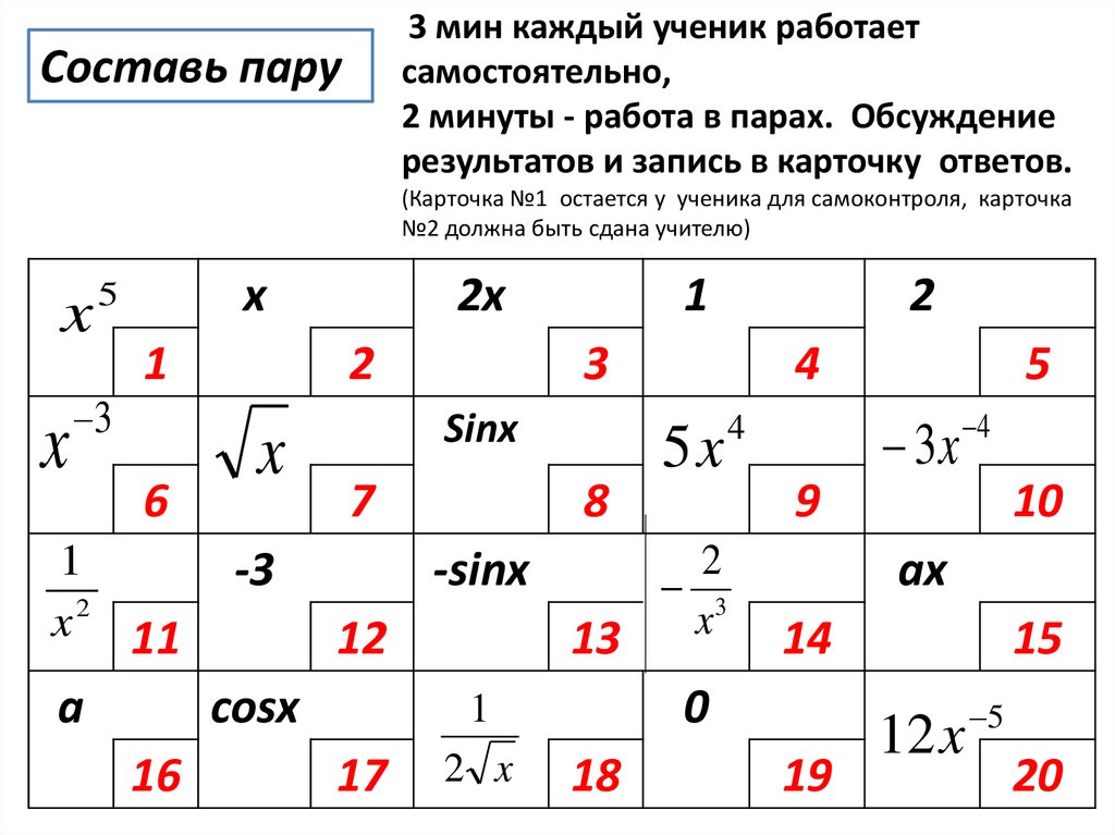 (Карточка №1 остается у ученика для самоконтроля, карточка