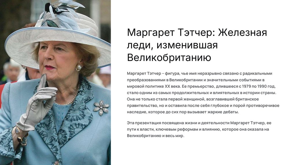 Эта презентация посвящена жизни и деятельности Маргарет Тэтчер, ее