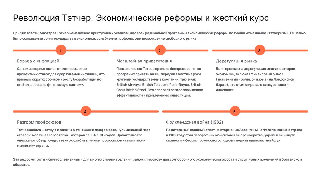 Революция Тэтчер: Экономические реформы и жесткий курсПридя к власти, Маргарет Тэтчер немедленно приступила к реализации своей радикальной программы экономических реформ, получивших название «тэтчеризм». Ее целью