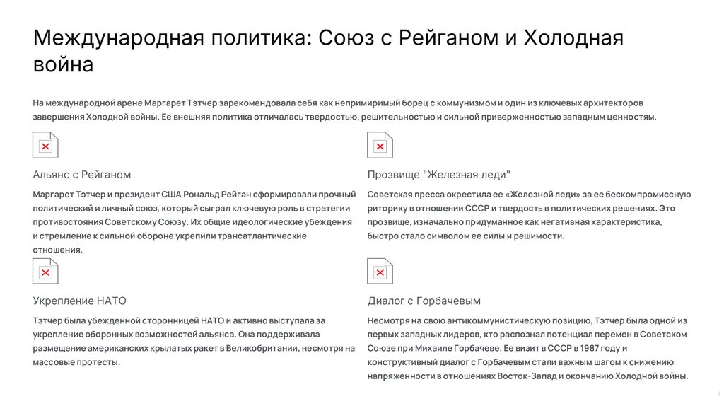 завершения Холодной войны. Ее внешняя политика отличалась твердостью, решительностью и сильной приверженностью западным ценностям.