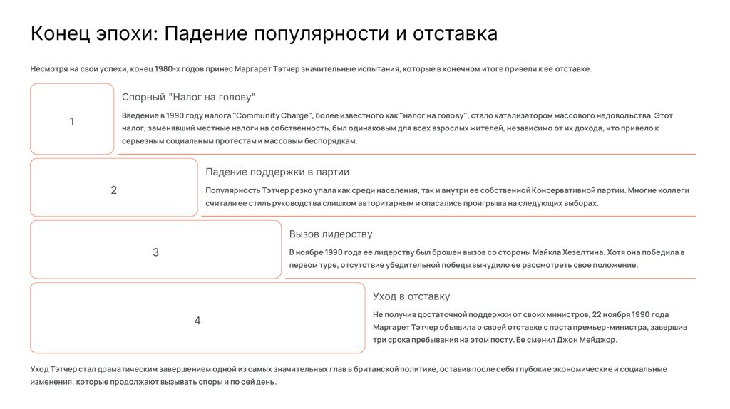 Конец эпохи: Падение популярности и отставкаНесмотря на свои успехи, конец 1980-х годов принес Маргарет Тэтчер значительные испытания, которые в конечном итоге привели к ее отставке.
