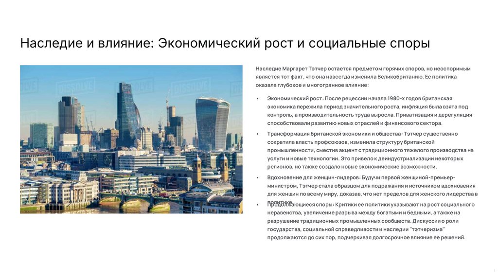 Наследие и влияние: Экономический рост и социальные спорыНаследие Маргарет Тэтчер остается предметом горячих споров, но неоспоримым