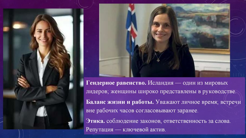 Гендерное равенство. Исландия — один из мировыхлидеров; женщины широко представлены в руководстве.