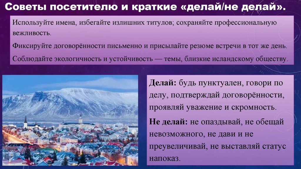 Советы посетителю и краткие «делай/не делай».Используйте имена, избегайте излишних титулов; сохраняйте профессиональную