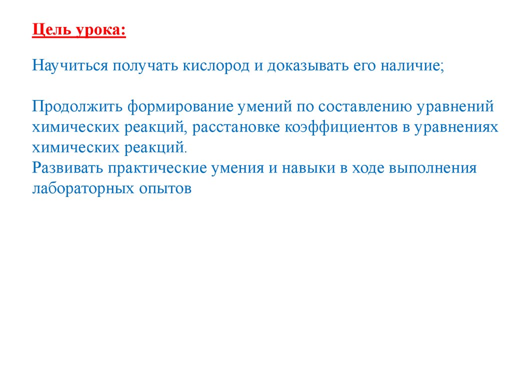 Цель урока:Научиться получать кислород и доказывать его наличие;