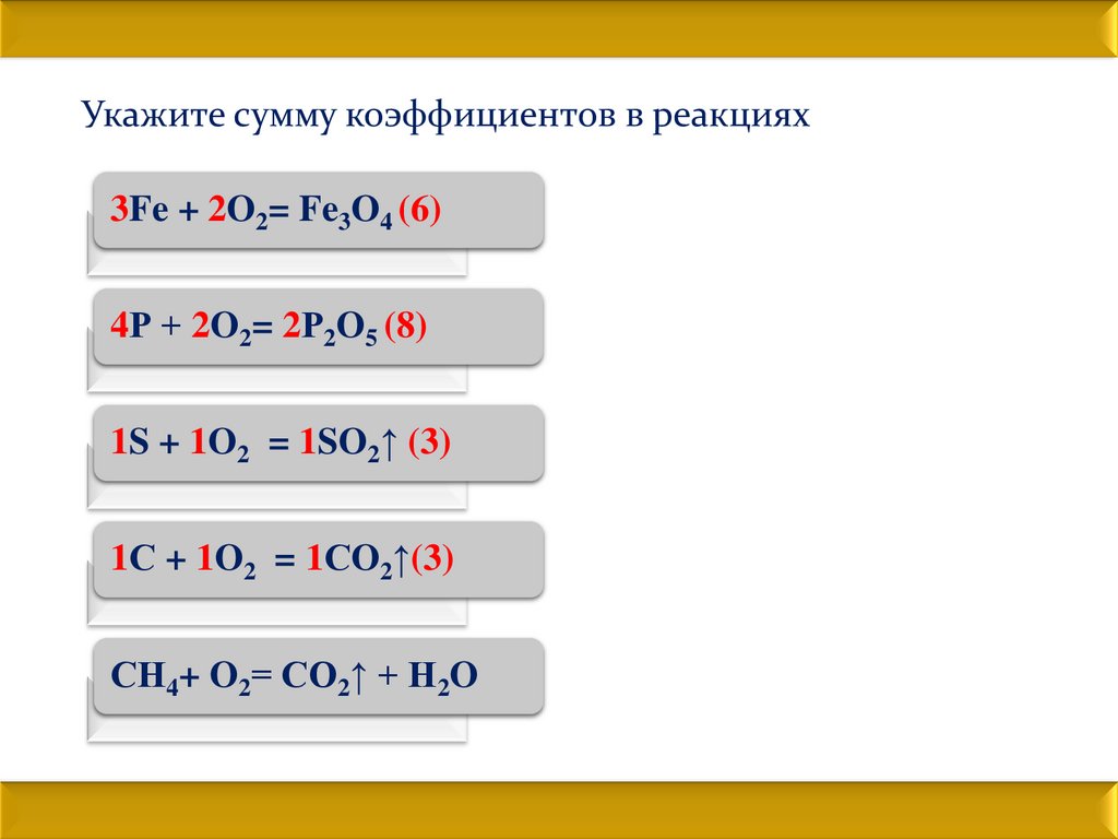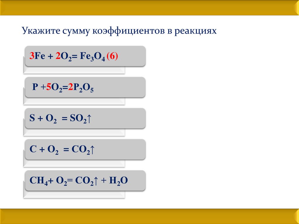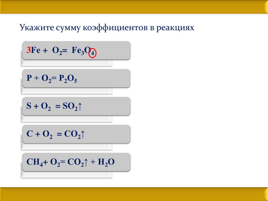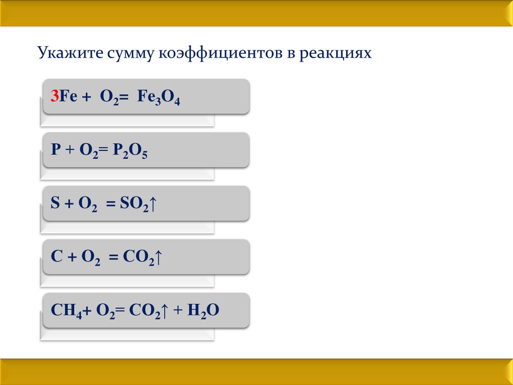 Укажите сумму коэффициентов в реакцияхFe + O2= Fe3O4