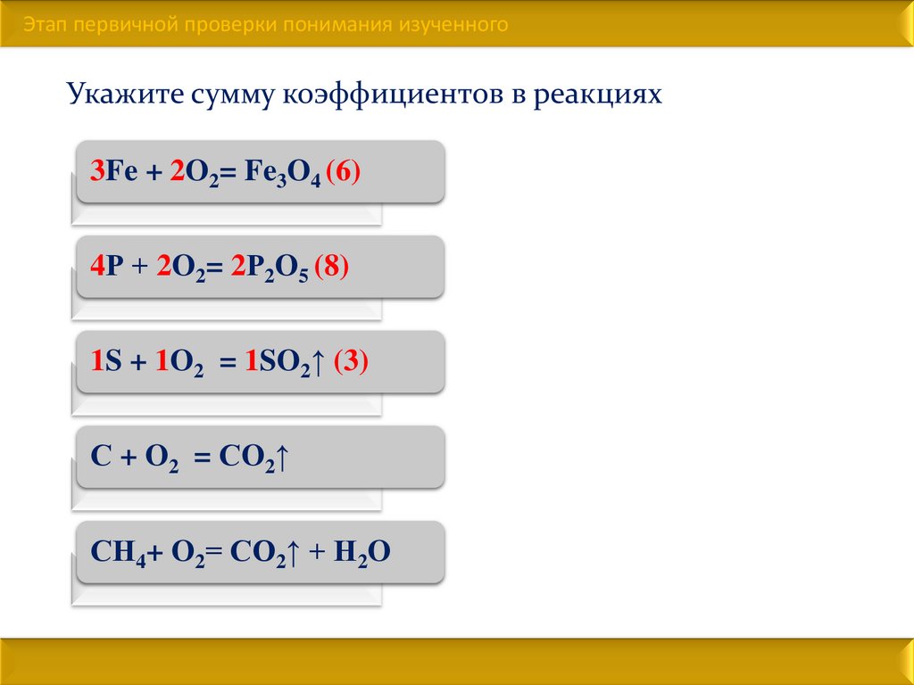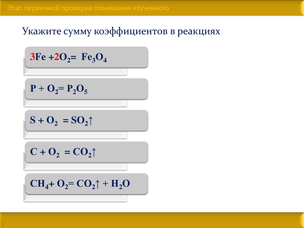 Этап первичной проверки понимания изученногоУкажите сумму коэффициентов в реакциях