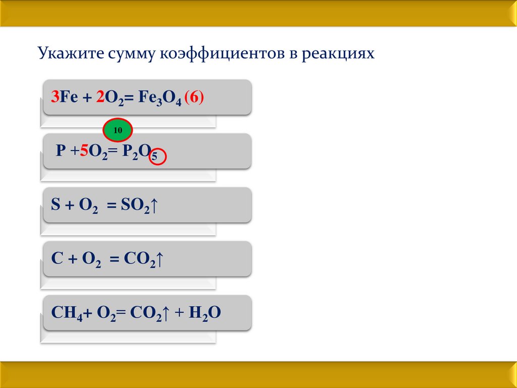 Укажите сумму коэффициентов в реакциях3Fe + O2= Fe3O4