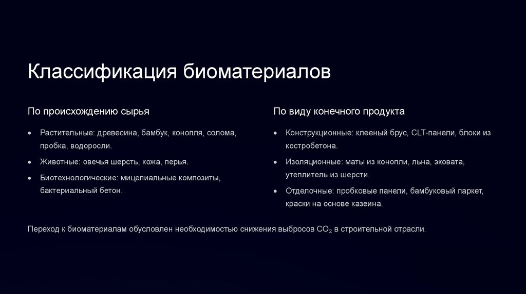 Переход к биоматериалам обусловлен необходимостью снижения выбросов CO₂ в строительной отрасли.