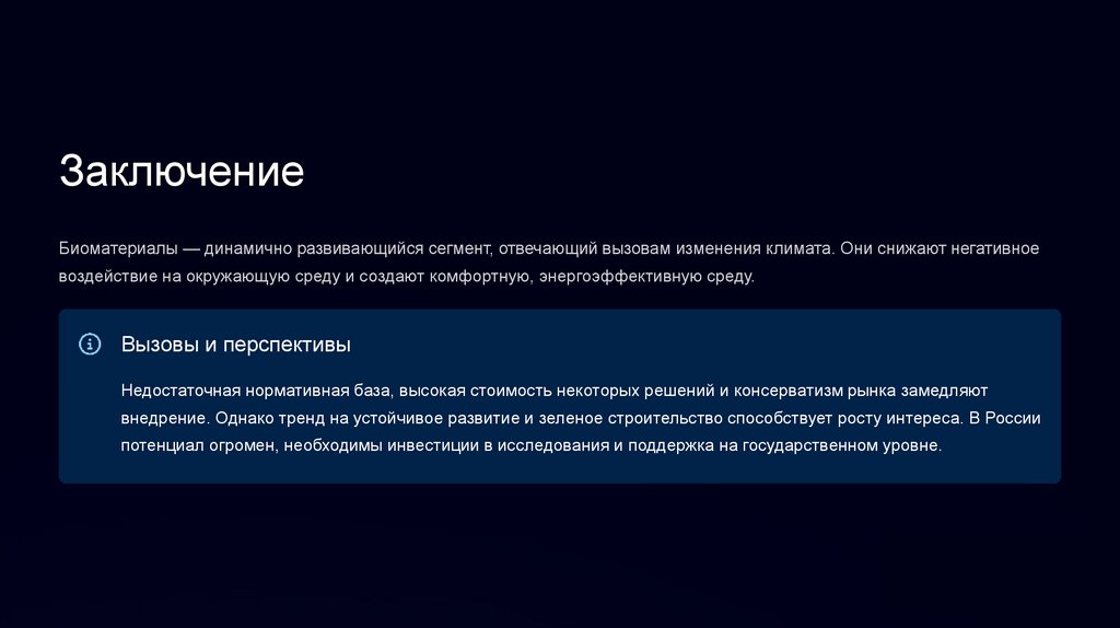 ЗаключениеБиоматериалы — динамично развивающийся сегмент, отвечающий вызовам изменения климата. Они снижают негативное