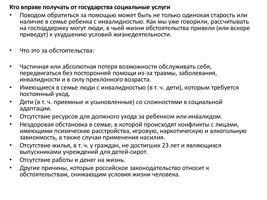 Кто вправе получать от государства социальные услуги• Поводом обратиться за помощью может быть не только одинокая старость или