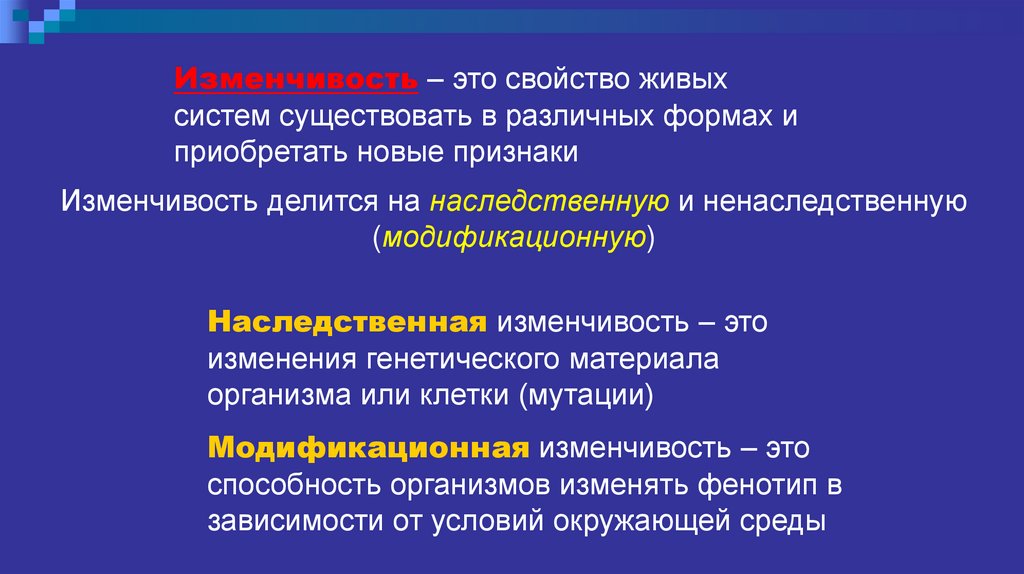 Изменчивость – это свойство живыхсистем существовать в различных формах и