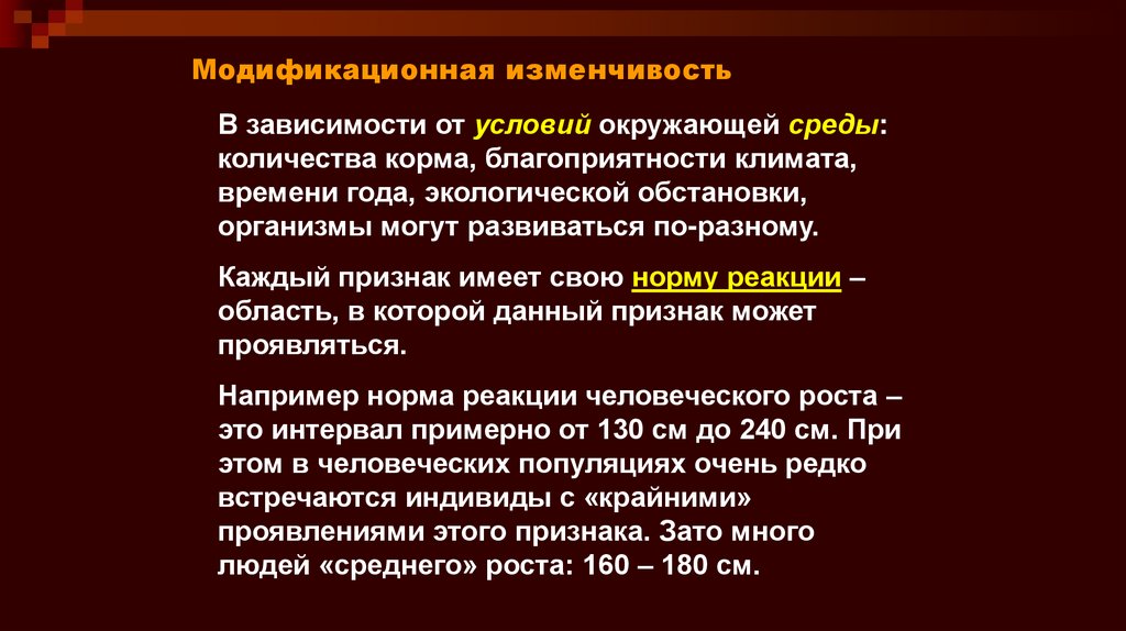Модификационная изменчивостьВ зависимости от условий окружающей среды: