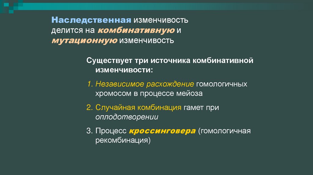 Наследственная изменчивостьделится на комбинативную и