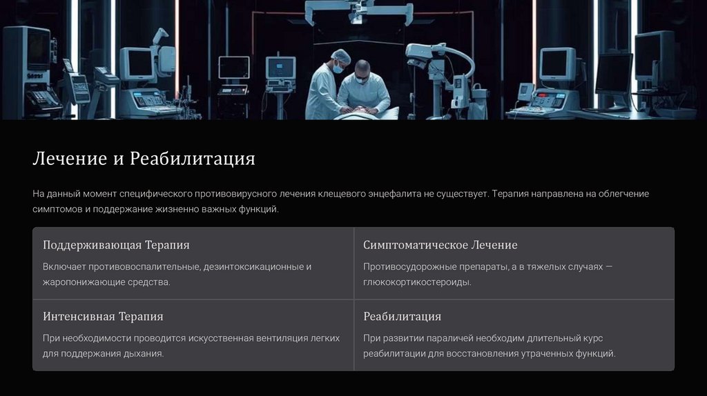 Лечение и РеабилитацияНа данный момент специфического противовирусного лечения клещевого энцефалита не существует. Терапия направлена на облегчение