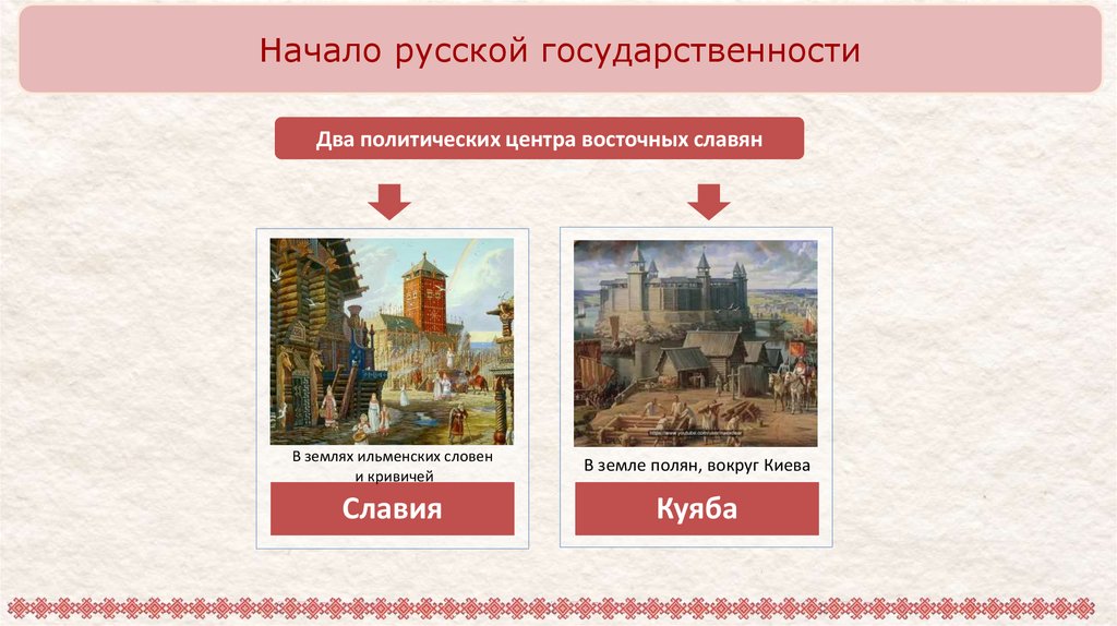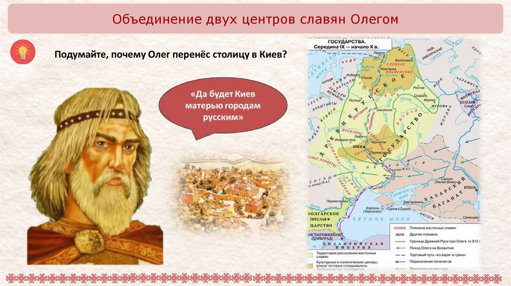Объединение двух центров славян ОлегомПодумайте, почему Олег перенёс столицу в Киев?