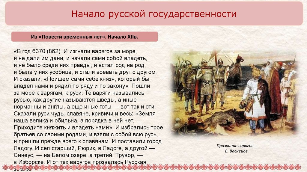 Начало русской государственностиИз «Повести временных лет». Начало XIIв.