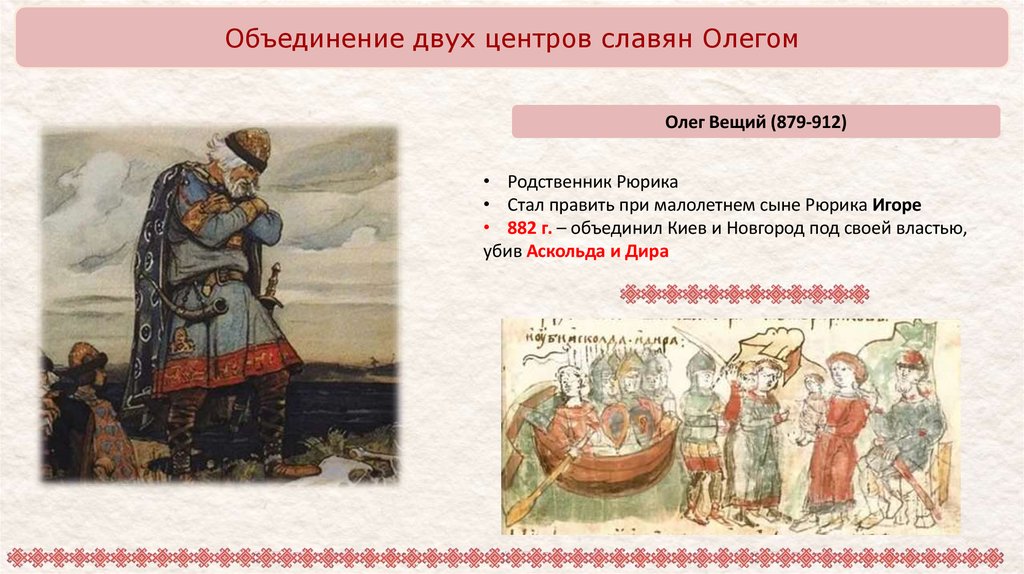 • 882 г. – объединил Киев и Новгород под своей властью,