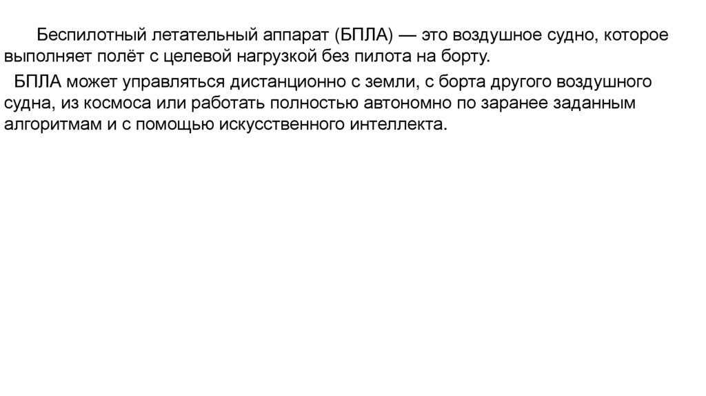 Беспилотный летательный аппарат (БПЛА) — это воздушное судно, котороевыполняет полёт с целевой нагрузкой без пилота на борту.