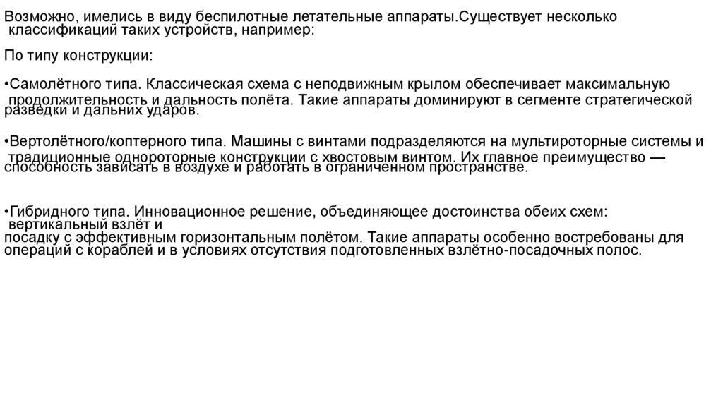 Возможно, имелись в виду беспилотные летательные аппараты.Существует несколькоклассификаций таких устройств, например: