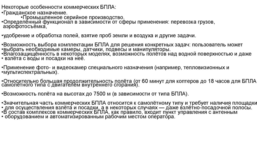 Некоторые особенности коммерческих БПЛА:•Гражданское назначение.