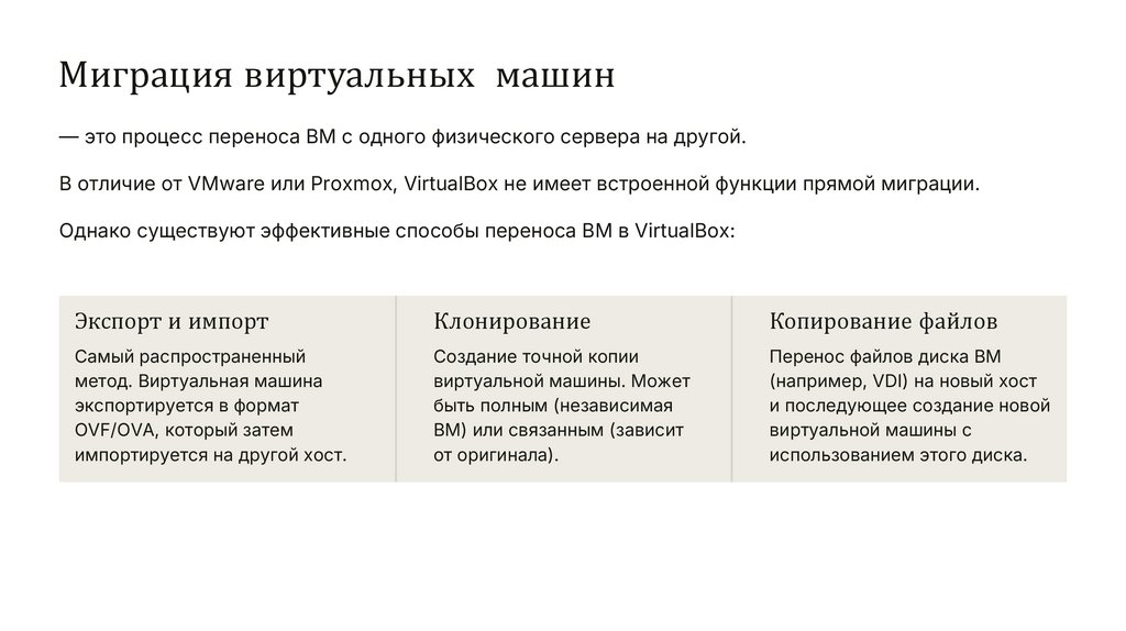 В отличие от VMware или Proxmox, VirtualBox не имеет встроенной функции прямой миграции.