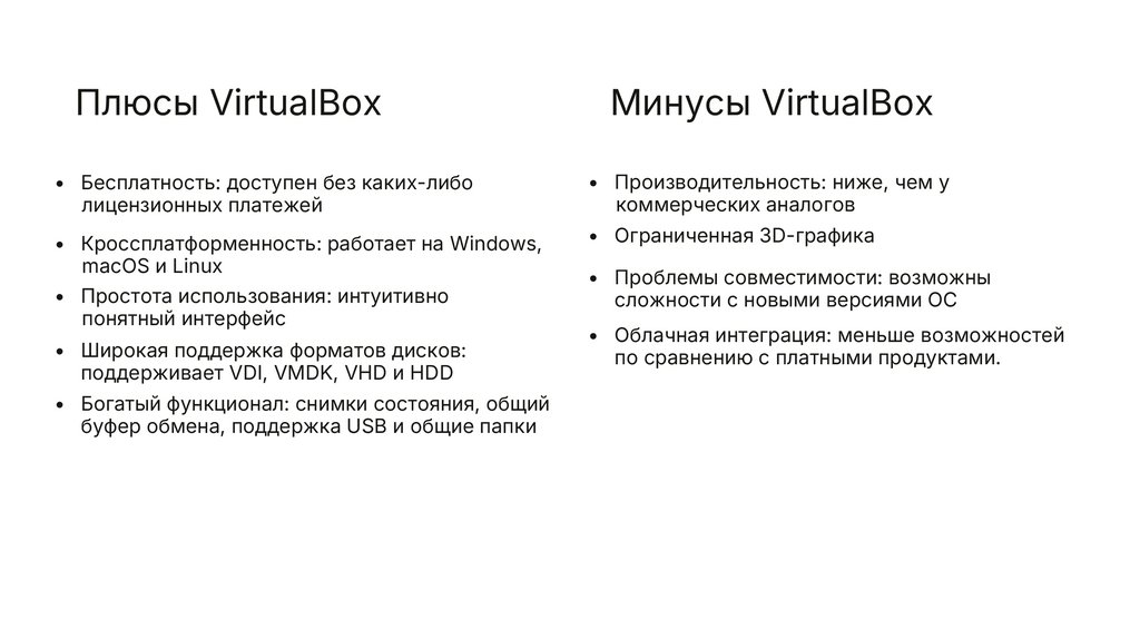 Плюсы VirtualBoxМинусы VirtualBox