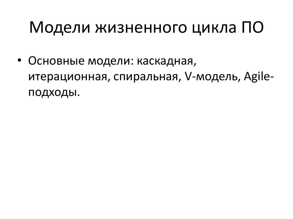 Модели жизненного цикла ПО• Основные модели: каскадная,
