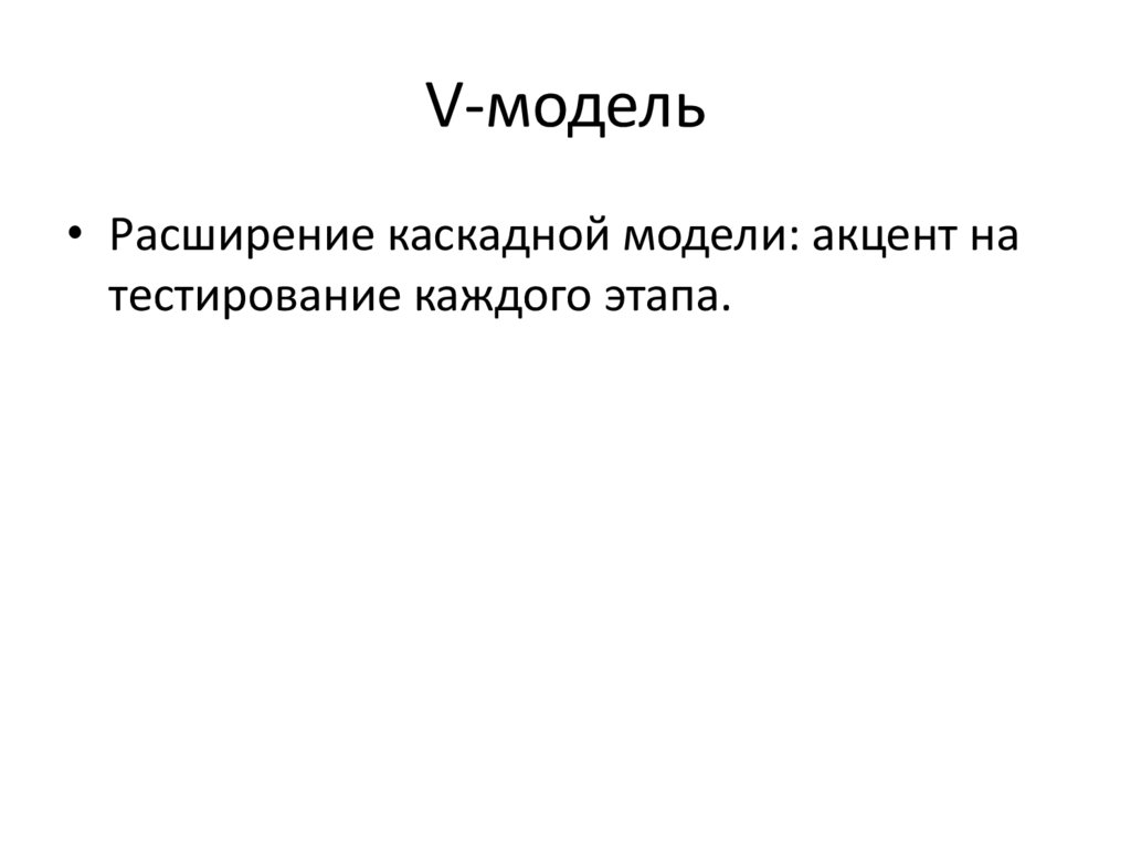V-модель• Расширение каскадной модели: акцент на