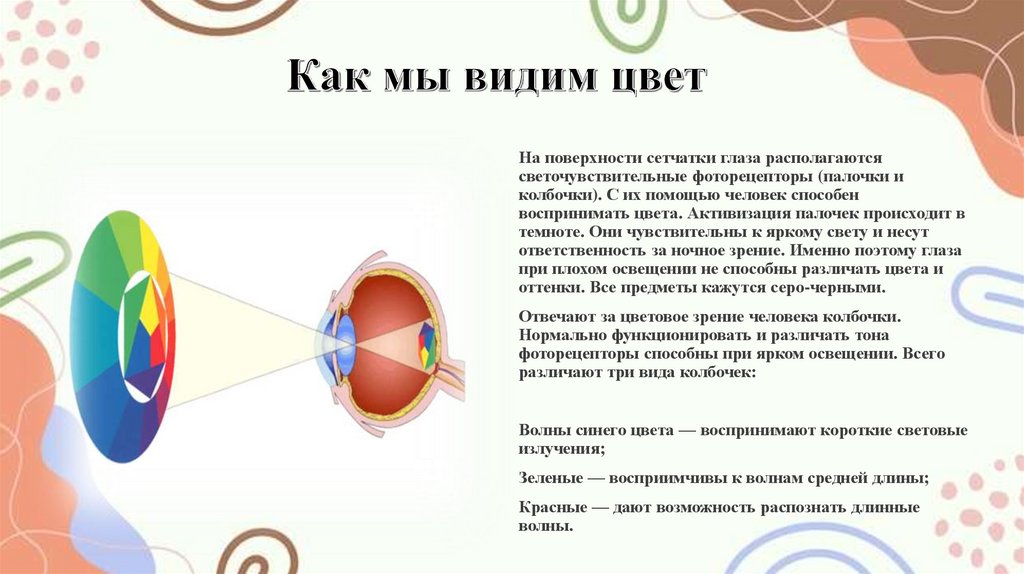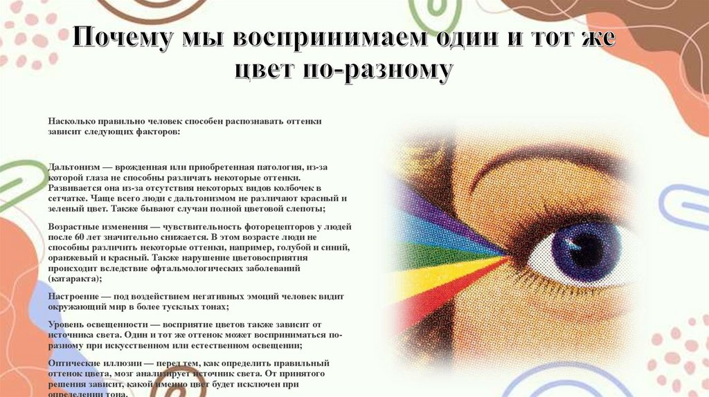 Насколько правильно человек способен распознавать оттенкизависит следующих факторов: