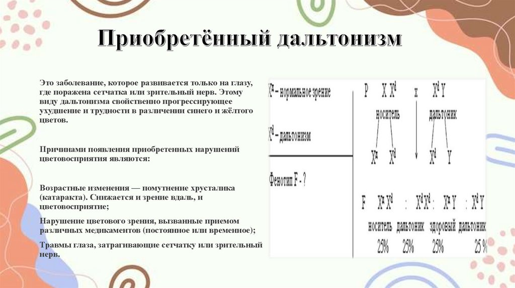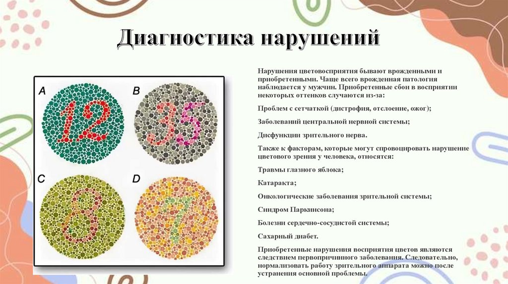Нарушения цветовосприятия бывают врожденными иприобретенными. Чаще всего врожденная патология