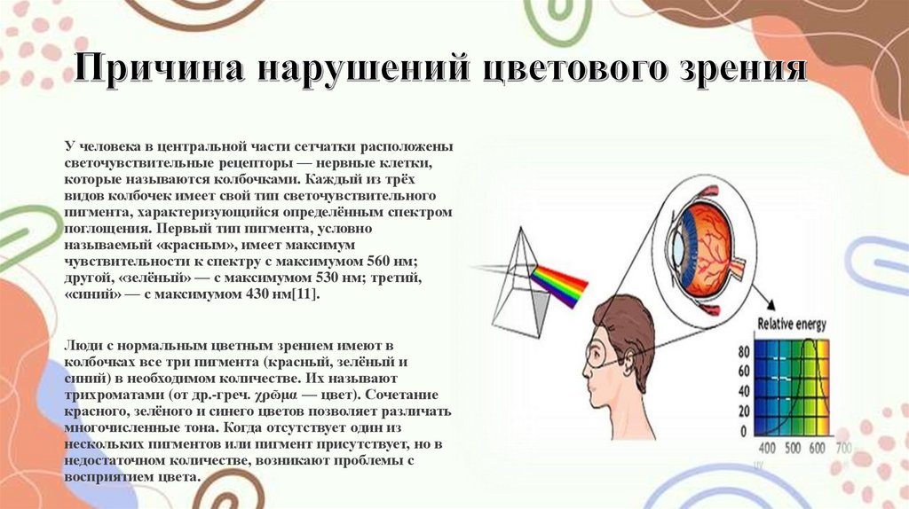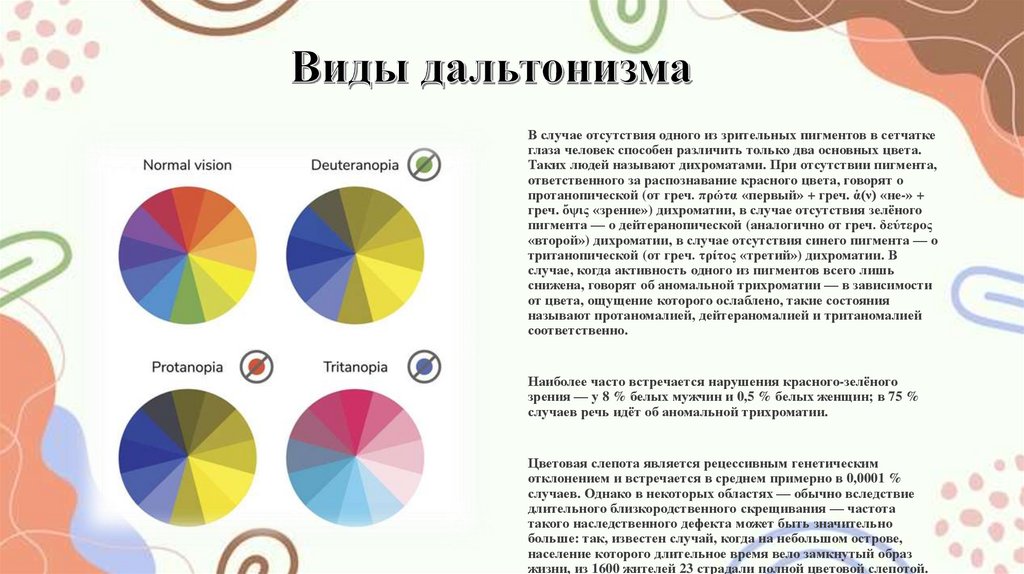 сетчатке. Чаще всего люди с дальтонизмом не различают красный и