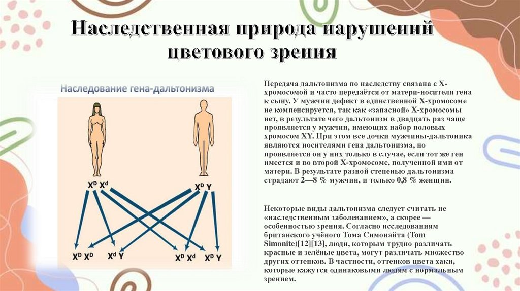 Передача дальтонизма по наследству связана с Xхромосомой и часто передаётся от матери-носителя генак сыну. У мужчин дефект в единственной X-хромосоме