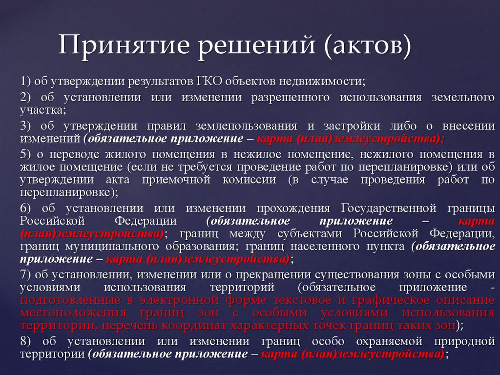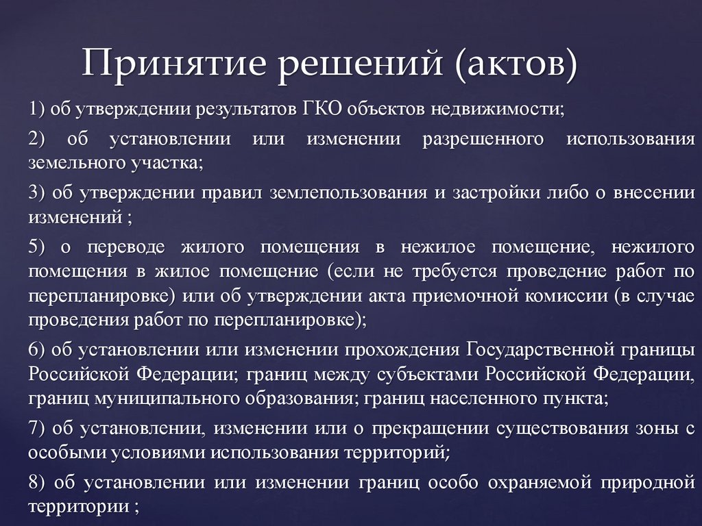 Принятие решений (актов)1) об утверждении результатов ГКО объектов недвижимости;