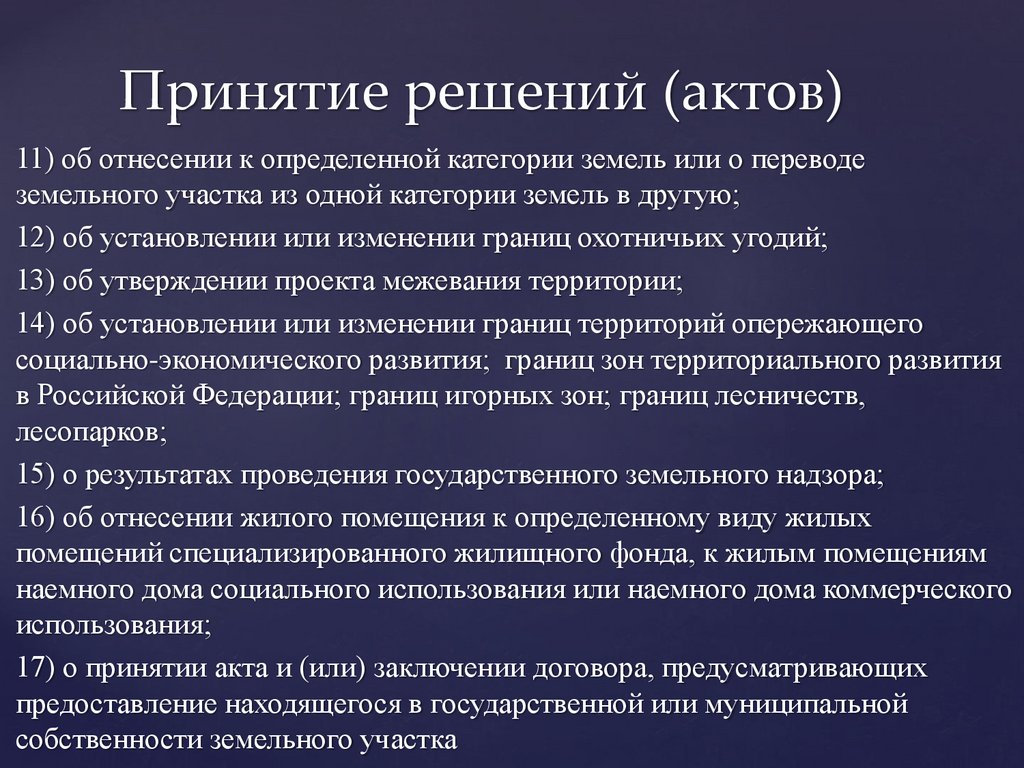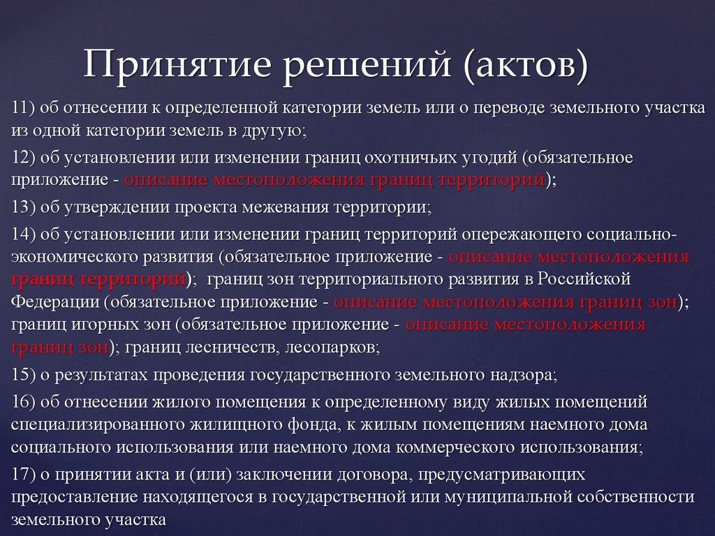 Принятие решений (актов)11) об отнесении к определенной категории земель или о переводе