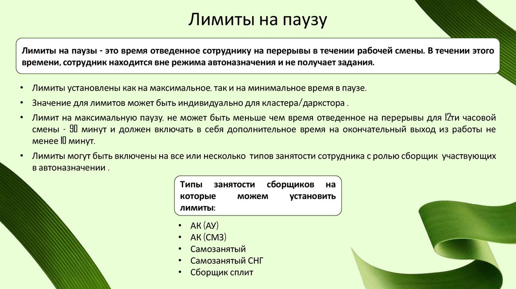 Лимиты на паузуЛимиты на паузы - это время отведенное сотруднику на перерывы в течении рабочей смены. В течении этого