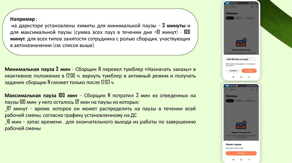Минимальная пауза 3 мин - Сборщик N перевел тумблер «Назначать заказы» в