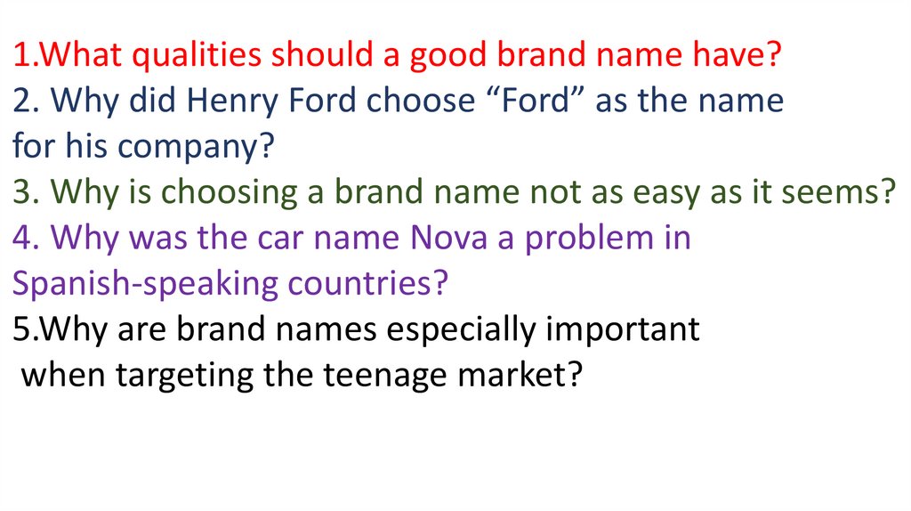 1.What qualities should a good brand name have?2. Why did Henry Ford choose “Ford” as the name