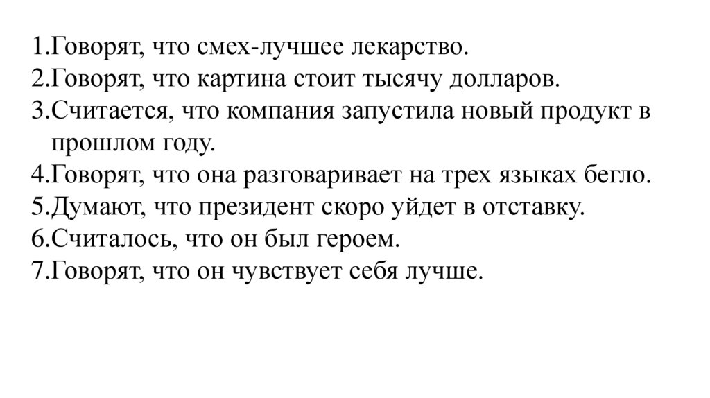 1.Говорят, что смех-лучшее лекарство.2.Говорят, что картина стоит тысячу долларов.