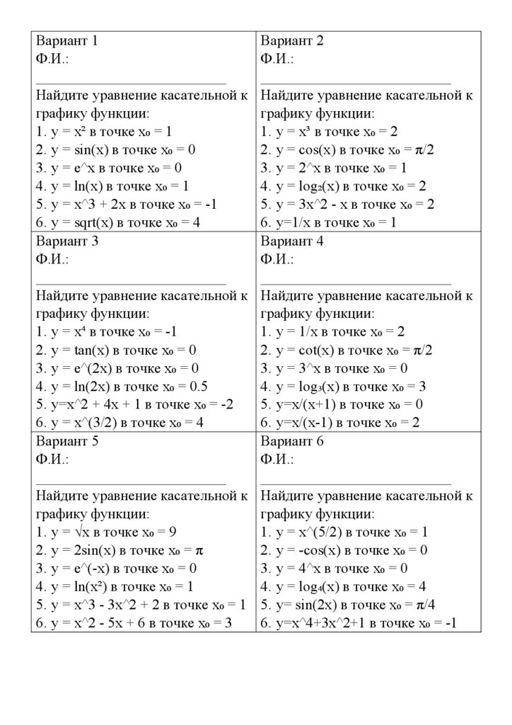 Вариант 2: y = 12x - 16; y = -x + π/2; y = 2ln(2)x + 2 - 2ln(2); y =