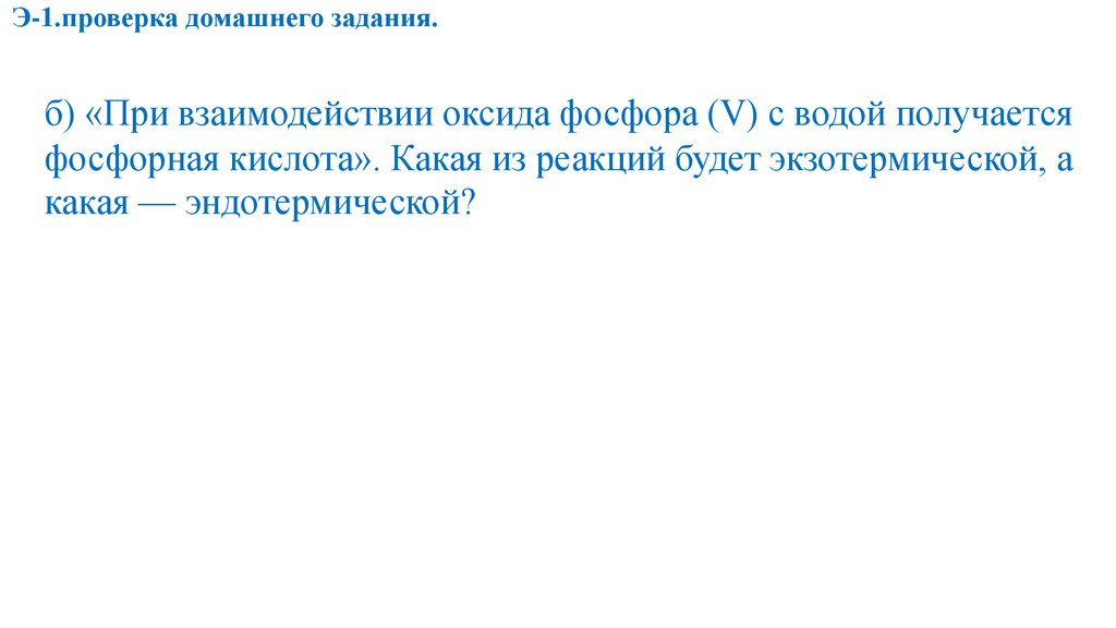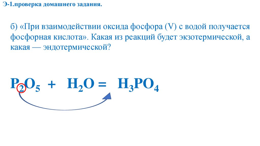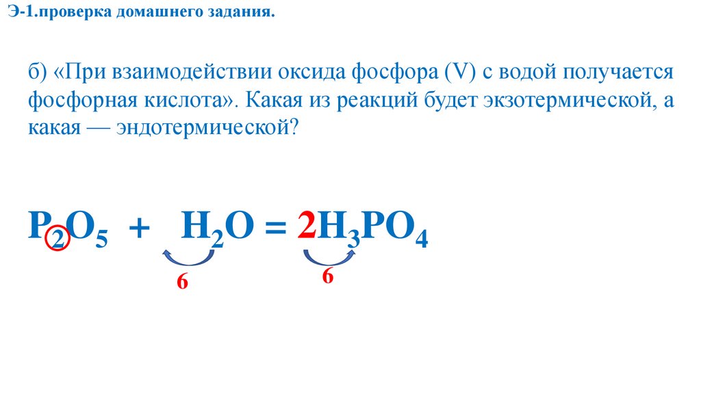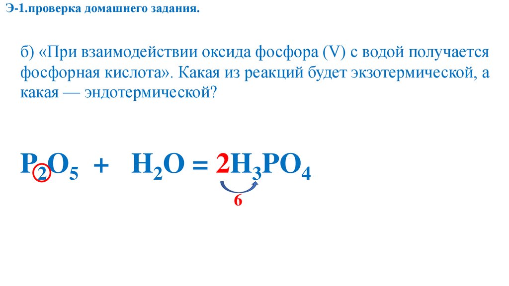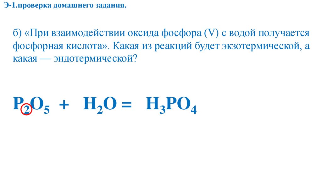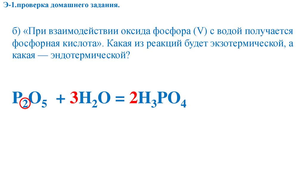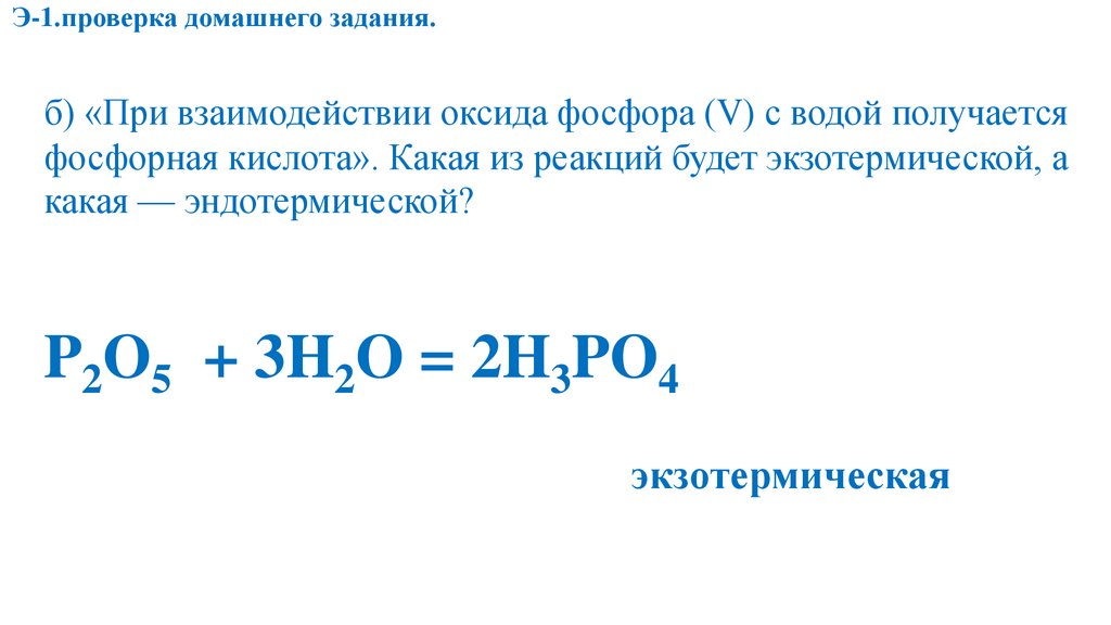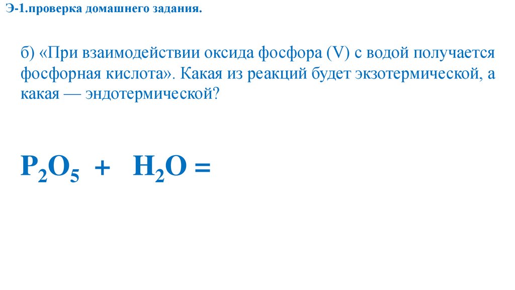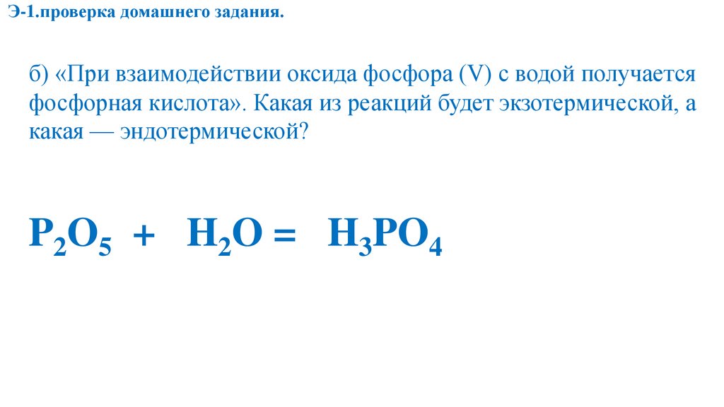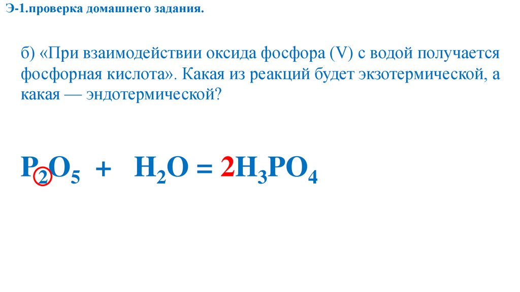 Э-1.проверка домашнего задания.б) «При взаимодействии оксида фосфора (V) с водой получается