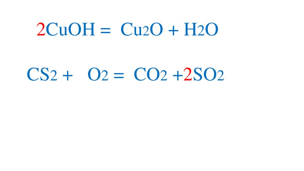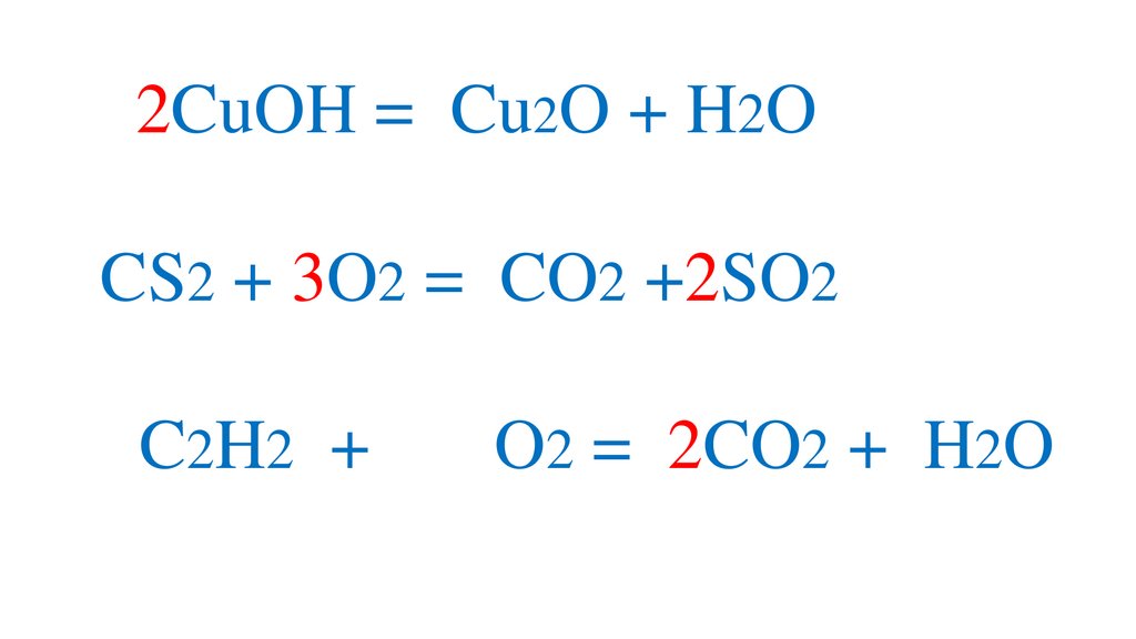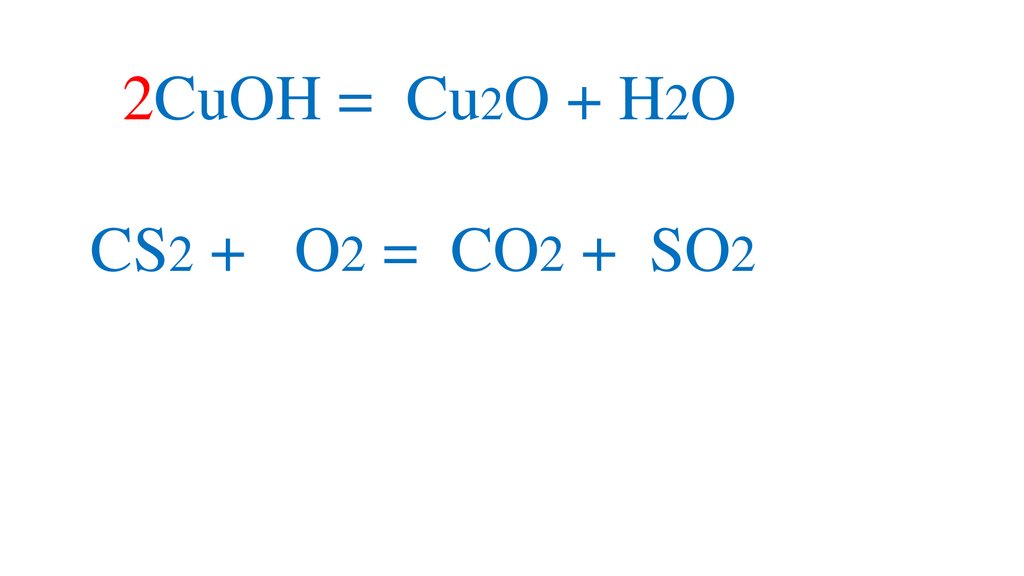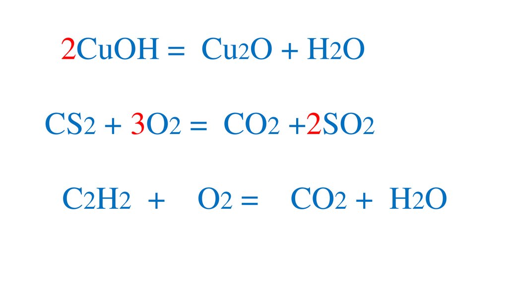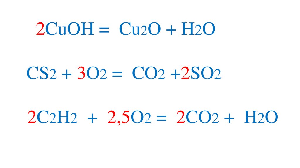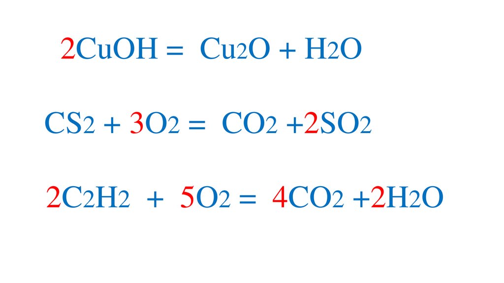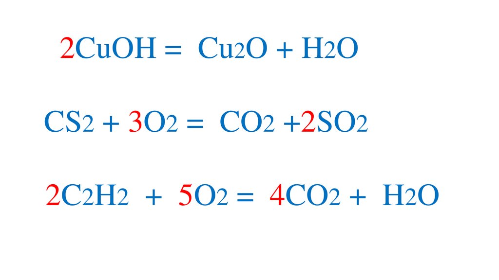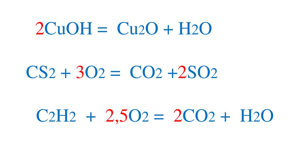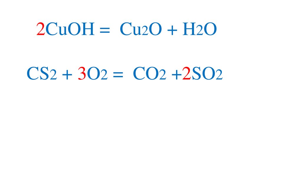 2CuOH = Cu2O + H2OCS2 + 3O2 = CO2 +2SO2