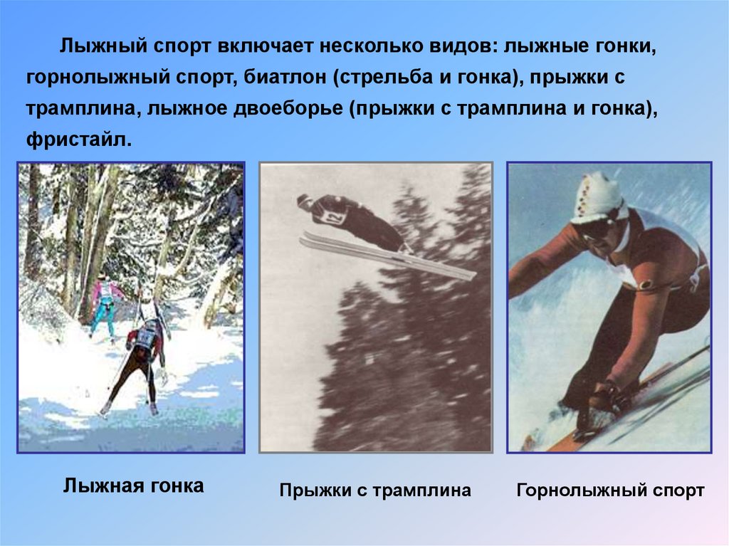 Лыжный спорт включает несколько видов: лыжные гонки,горнолыжный спорт, биатлон (стрельба и гонка), прыжки с