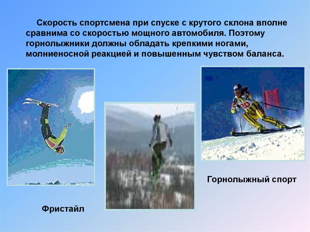 Скорость спортсмена при спуске с крутого склона вполнесравнима со скоростью мощного автомобиля. Поэтому