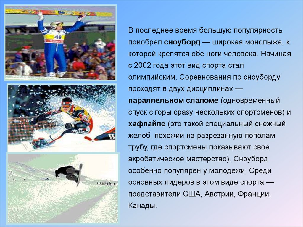 В последнее время большую популярностьприобрел сноуборд — широкая монолыжа, к