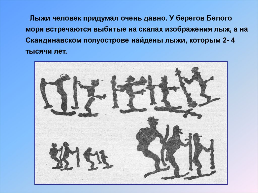 Лыжи человек придумал очень давно. У берегов Белогоморя встречаются выбитые на скалах изображения лыж, а на