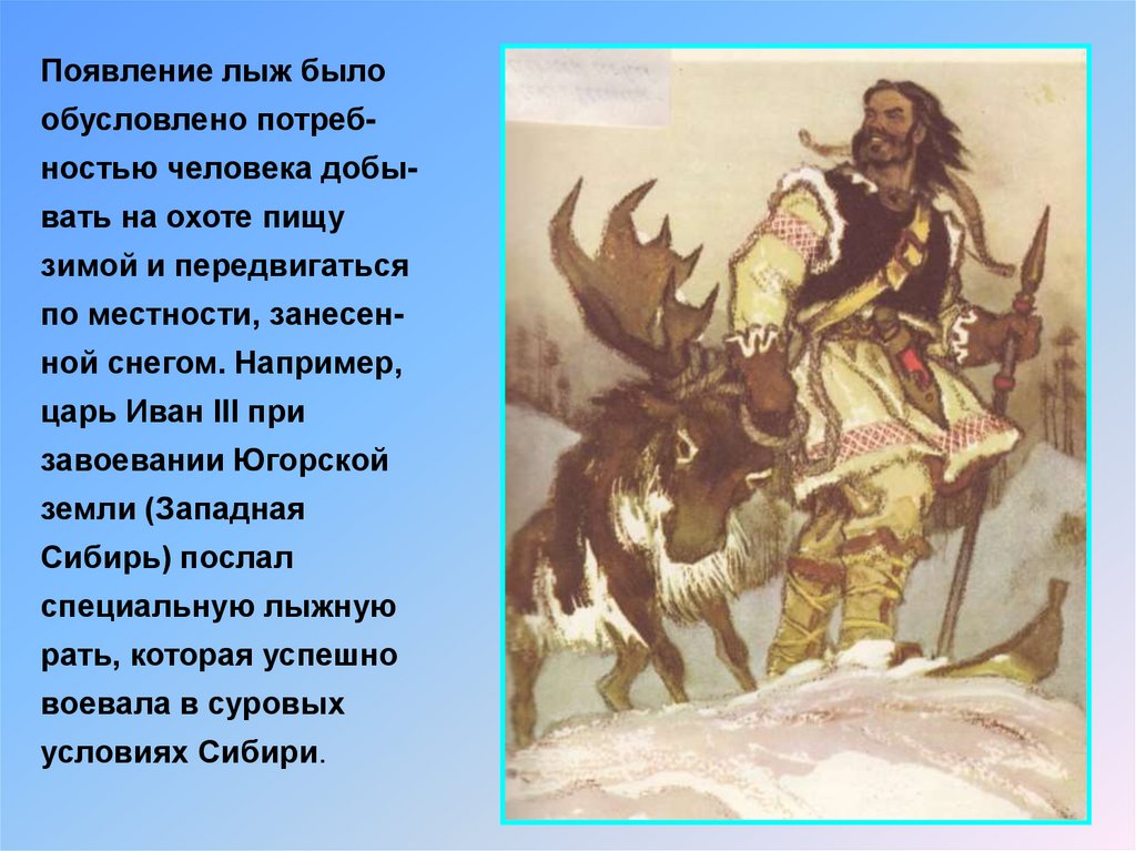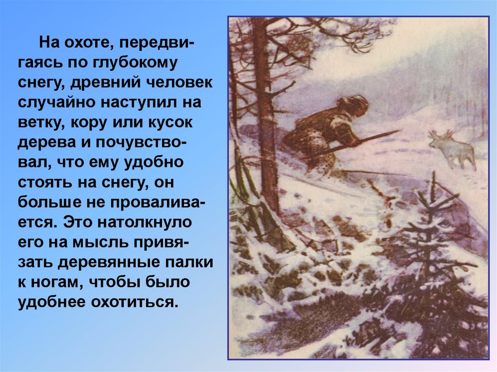 Появление лыж былообусловлено потребностью человека добывать на охоте пищу